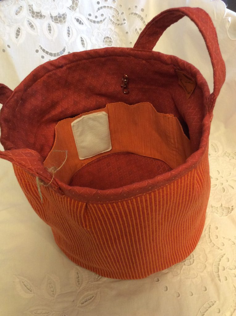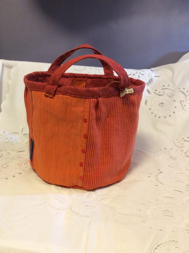 Iso oranssi laukku, nro 56 Myydyt Projektilaukut 38 euroa, MYYTY Kierrätyspoppanasta tehty. Korkeus 29 cm, halkaisija 32 cm ja tilavuus 23 litraa. Vuori puuvillaa.