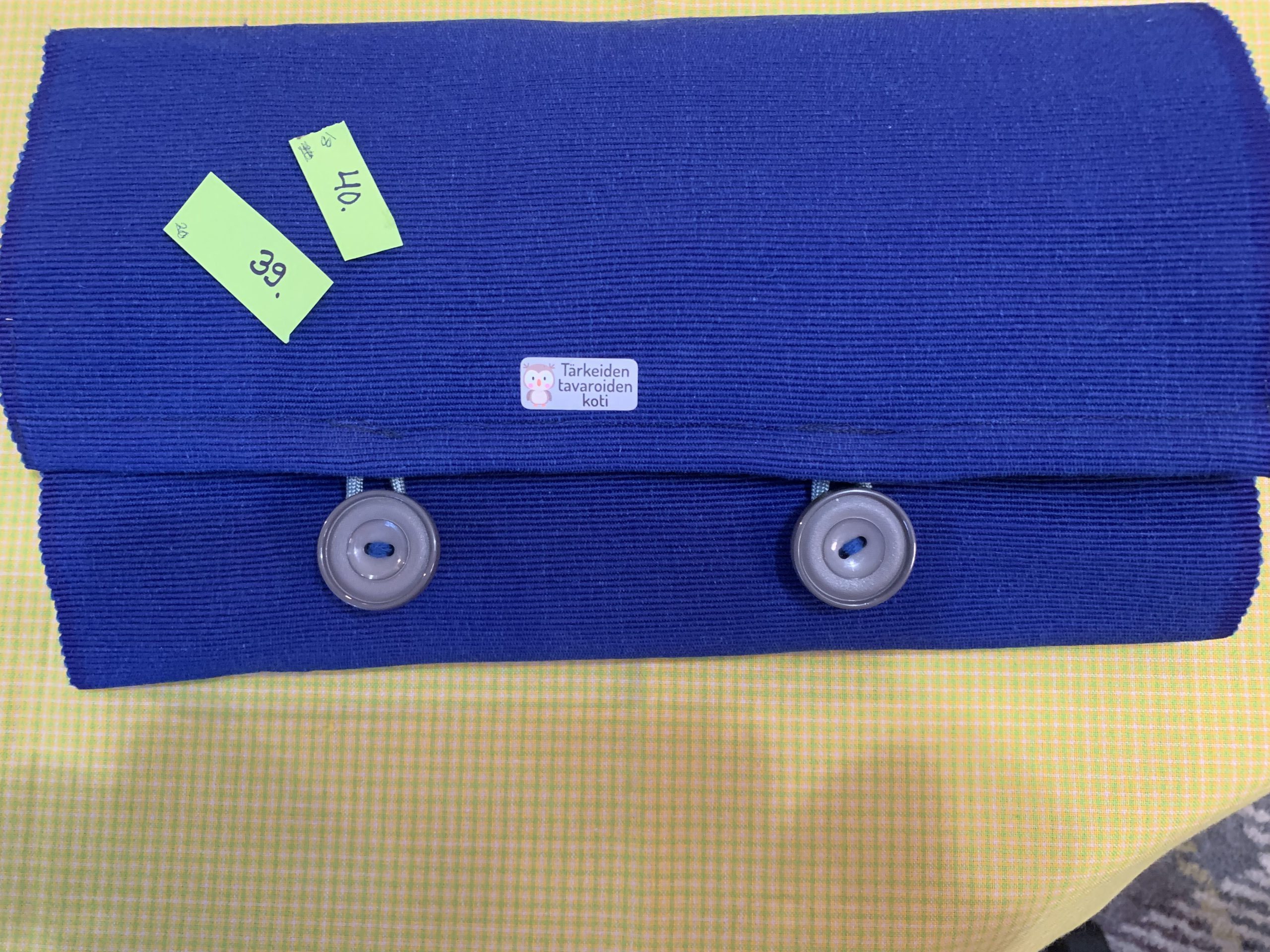 Sininen puikkokotelo, nro 40 Puikkokotelot 39 euroa Sininen poppanasta tehty kotelo. Suljetaan isoilla napeilla. Koko suljettuna K 32 cm ja L 20 cm. 22 puikkotaskua. Koko avoinna K 32 cm ja L 55 cm.
